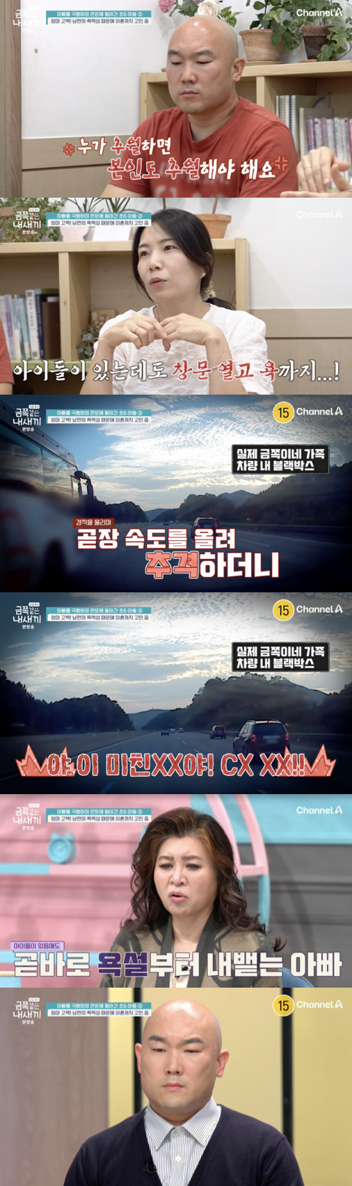 이어지 장면에서는 실제 가족 차량 내 블랙박스 영상이 공개됐다. 영상에는 버스가 차선을 추월하자 남편이 뒷좌석에 아이들이 타고 있음에도 불구하고 연달아 욕설을 내뱉으며 급하게 운전하는 장면이 고스란히 담겨 시청자들의 마음을 무겁게 했다.