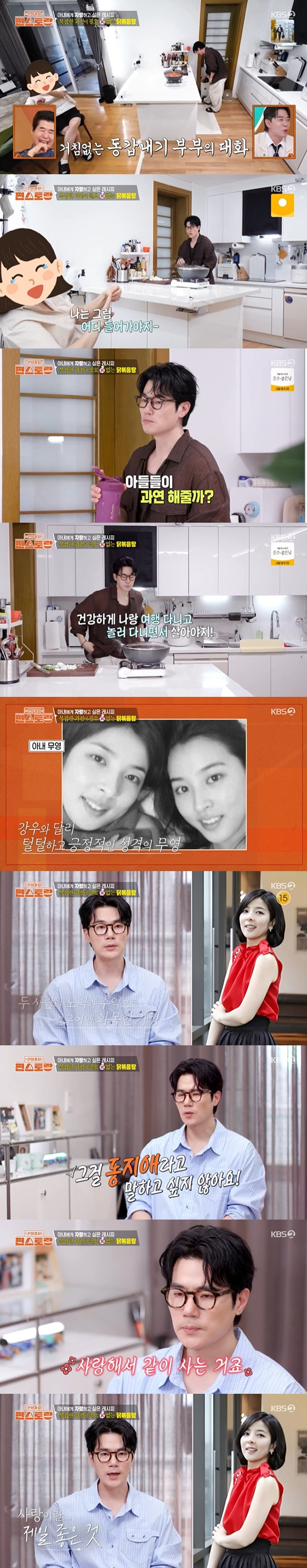 특히 김강우는 "저는 아내와 함께 모든 것을 경험했고, 모든 것을 이뤄왔다. 함께 무일푼으로 시작해서 점차 월셋집, 전셋집, 그리고 내 집을 마련했다. 식탁을 사고 의자를 사고, 아이들에게 책상도 사줬다. 다 우리가 같이 노력해서 만들어간 소중한 과정이다. 좋은 일이 많다 보면 나쁜 일도 생기고, 그걸 함께 헤쳐나가는 게 부부라고 생각한다. 다만 이걸 동지애라 말하고 싶지는 않다. 아내를 사랑해서 같이 사는 거다. 나는 아침에 아내 얼굴을 보면 반갑다. 사랑은 '제일 좋은 것'이다"라고 진정성 있게 이야기했다.