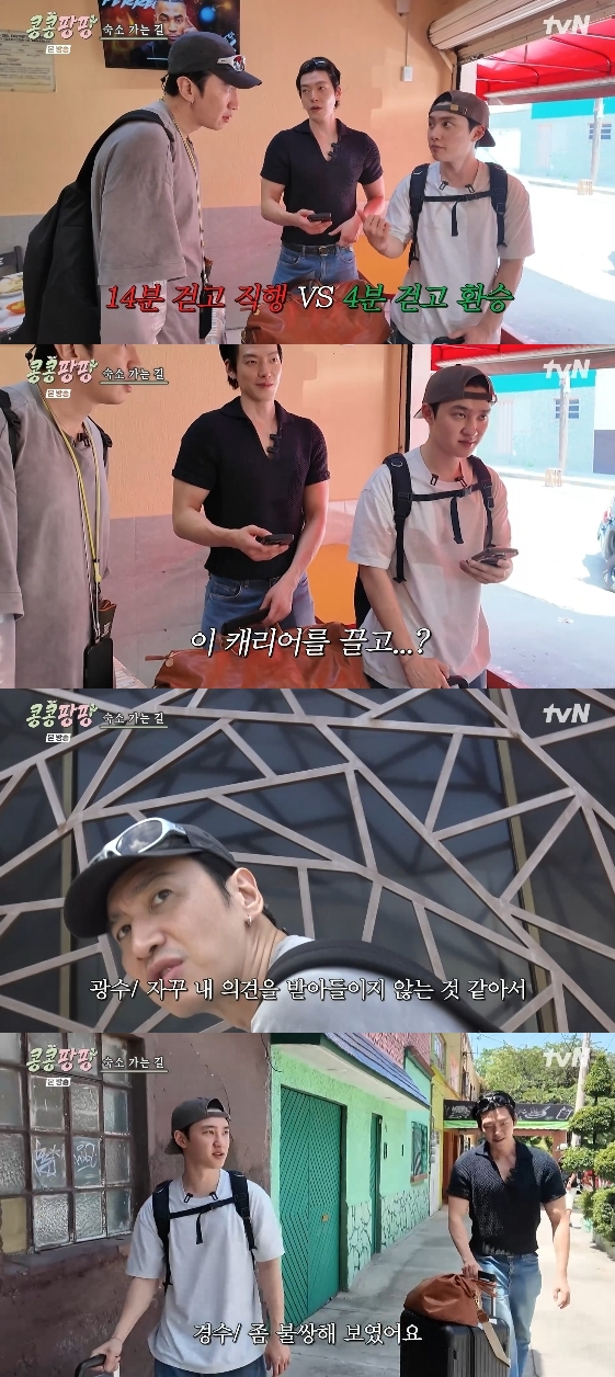 이광수는 "걸으면서 좀 보자. 타코 좀 사 먹자. 덥지도 않다"라고 목소리를 높였고, 김우빈과 도경수는 탐탁지 않은 표정을 지으며 마지못해 이광수의 의견을 따랐다.
