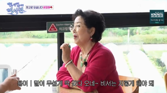 점심식사를 위해 식당에 도착한 뒤에도 이서진을 향한 선우용여의 '엄마 미소'는 계속됐다. 선우용여는 자신의 입맛에 맞는 메뉴를 고른 뒤 따뜻한 물을 건네는 이서진을 보며 "비서는 저렇게 해야 한다. 따뜻한 물을 말했더니 바로 갔다 오잖아"라고 칭찬했다.