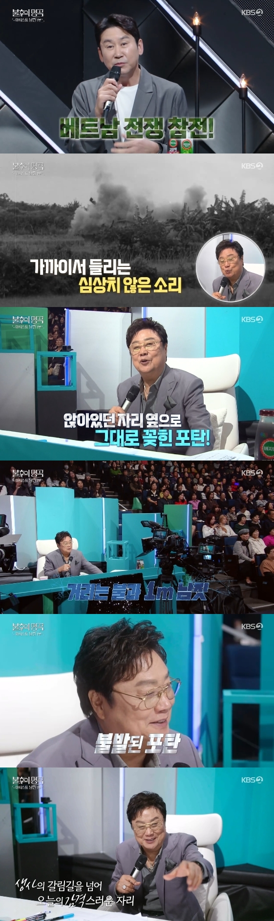 남진은 1969년에 발표된 '미워도 다시 한번'이 흥행할 당시 군에 입대해 2년간 베트남 전장을 누볐다고 털어놔 시선을 모았다. 그는 "막 반응이 뜰 때 월남에 파병했다. 그때 추억을 잊을 수가 없다"며 "저녁을 먹고 밤에 매복을 나가야 하는데 앉아서 일어나려는 순간 '쉬익'하는 소리가 났다. 저는 도착 일주일밖에 안돼서 전쟁이 익숙하지 않았다. 전부 '폭탄이다!'하고 피하는데 저는 피하지 못했다"라고 위험했던 순간을 회상했다.