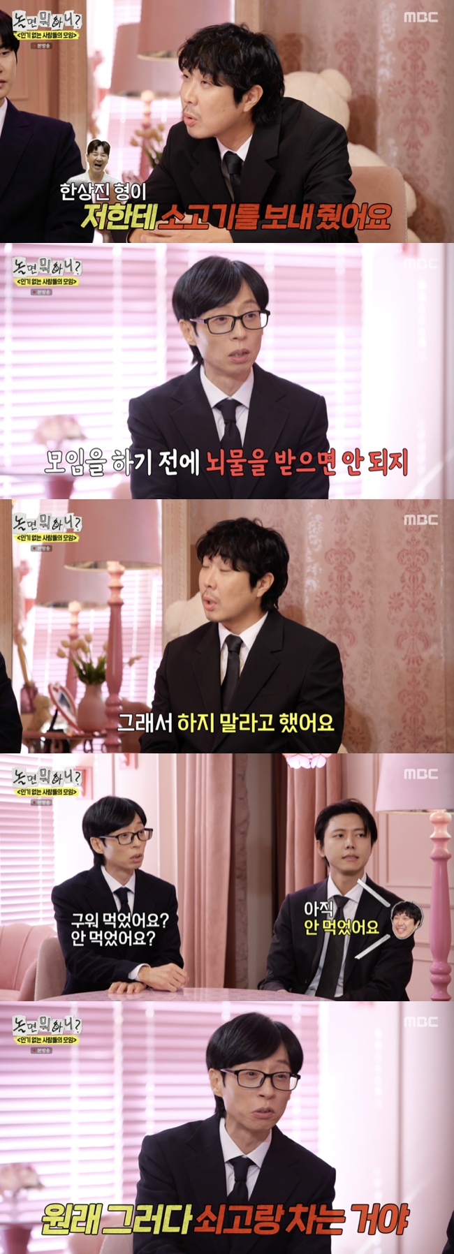 이 자리에서 하하는 "사실 한상진 형이 저한테 소고기를 보내줬다. 관리가 들어간 것"이라고 깜짝 고백했다. 예상치 못한 발언에 스튜디오는 술렁였고, 유재석은 "이렇게 모임 하기 전에 뇌물을 받고 그러면 안 되지"라고 단호하게 말했다. 이어 "구워 먹었냐, 안 먹었냐"라며 진실을 캐물었다.