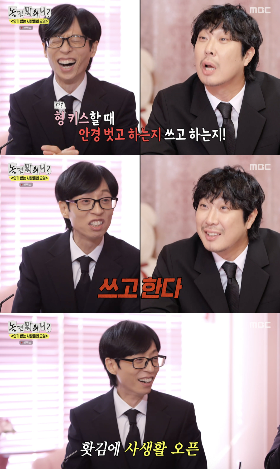 이날 하하는 최근 썸녀가 있다고 고백한 최홍만에게 연애스토리를 풀어달라고 고백했다. 그러면서 유재석에게도 "난 형도 궁금해. 형 키스할 떄 안경 벗고 하는지 쓰고 하는지"라고 물었다.