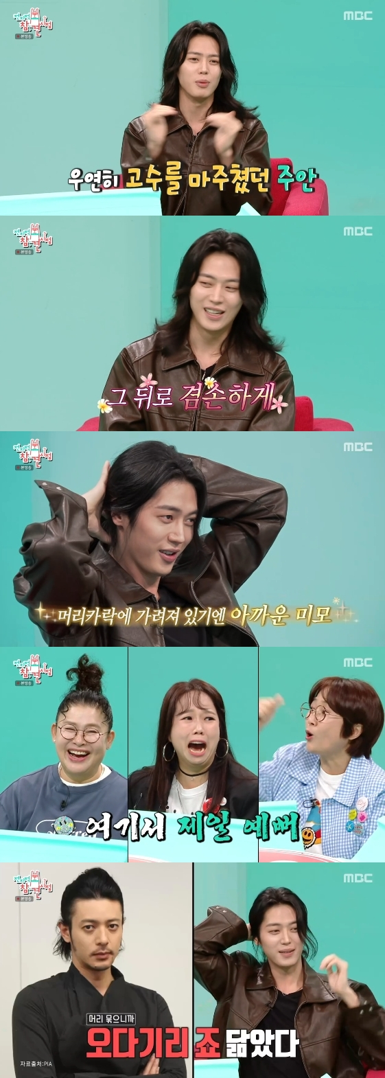 이주안은 머리를 묶어달라는 요청에 장발의 머리를 틀어 올렸고, 이를 본 여자 출연진들은 "예쁘다. 여기서 제일 예뻐"라고 목소리를 높여 웃음을 자아냈다. 유병재는 "오디기리 조 닮았다"라고 말해 공감을 얻었다.