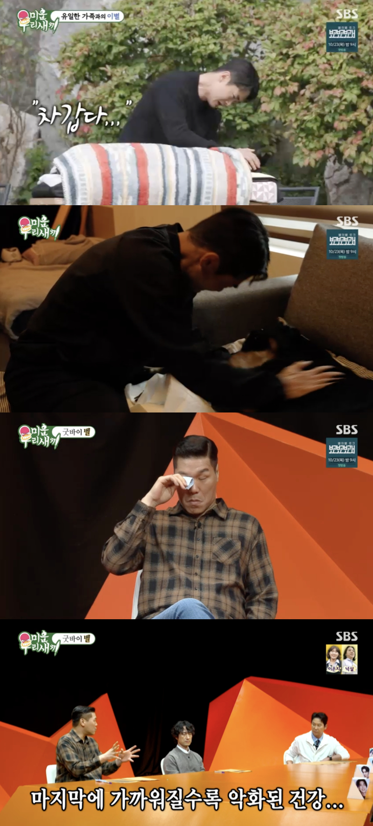 19일 방송된 SBS '미운 우리 새끼'에서는 반려견 벨과의 마지막 순간을 떠나보내는 배우 배정남의 이야기가 공개됐다. 그 장면을 스튜디오에서 지켜보던 서장훈은 눈시울을 붉히며 끝내 오열했다.