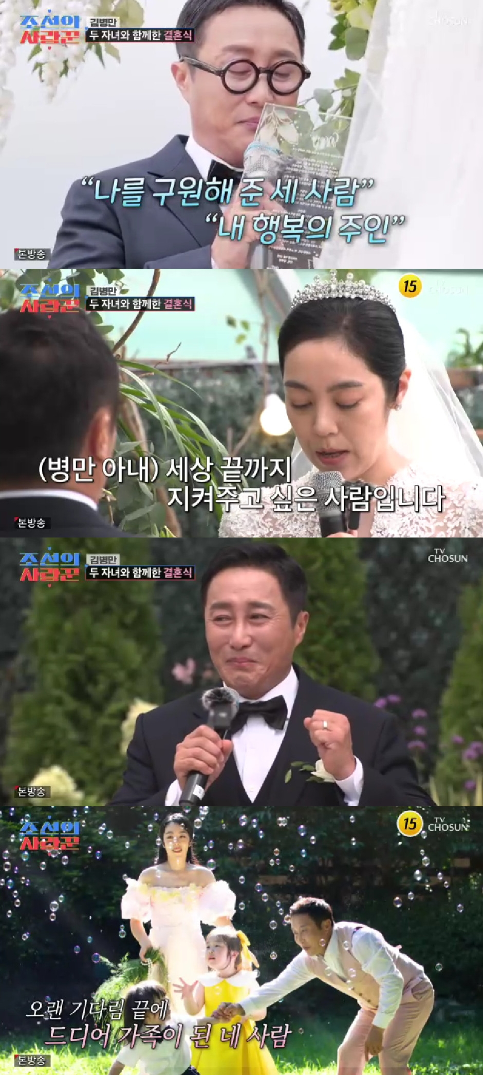 김병만은 혼인 서약에서 "참 오랜 시간이 걸렸다. 이 순간을 함께할 수 있는 건 혼자서는 빠져나올 수 없는 깊은 절망에서 나를 다시 일으켜 세워준 당신이 있었기 때문이다. 그동안의 고난과 역경은 당신을 다시 만나 행복을 되찾기 위한 과정이었음을 깨닫는다. 엄마로서뿐만 아니라 한 사람으로서도 빛날 수 있도록 언제나 존중하겠다. 나의 일부로 시작해서 이제는 나의 전부가 된 당신과 두 자녀가 내 구세주다. 나를 구원해 준 세 사람, 내 행복의 주인. 내 구세주들의 평온과 기쁨을 지키는 믿음직한 가장이 되겠다. 사랑한다. 더 소중히 사랑하겠다"고 울컥하는 모습을 보였다.