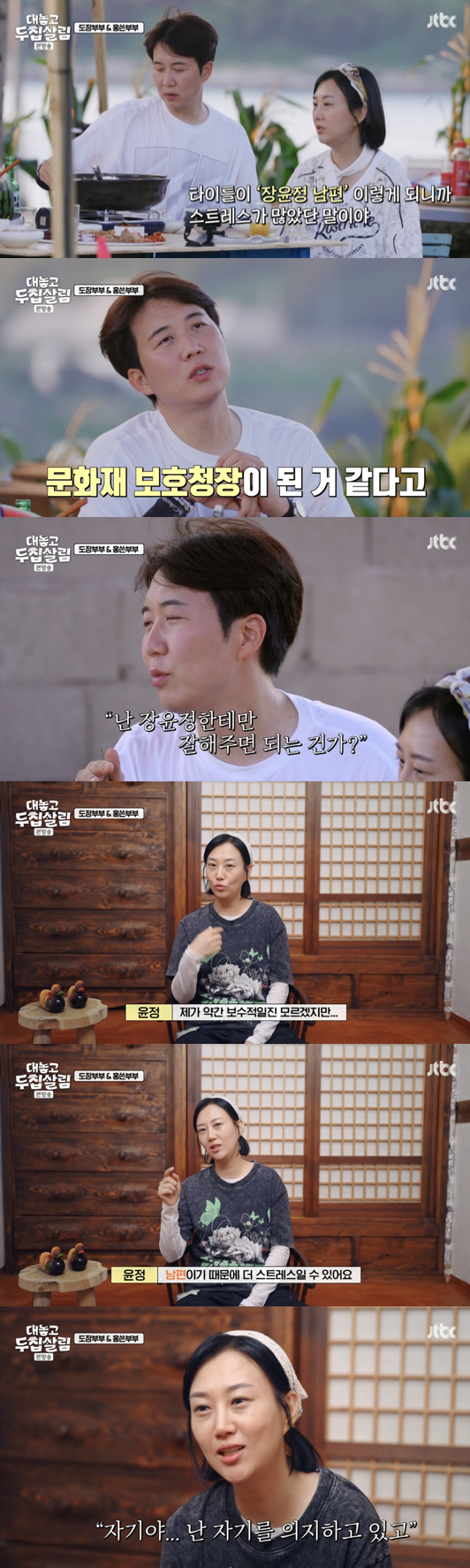 이날 장윤정은 "나이가 들어갈수록 좋은 사람과 맛있는 거 먹는 게 제일 행복한 것 같아"라고 말했다. 이어 "경완 씨랑 나랑 살 때 되게 힘들었다. 남편이 '문화재 보호청장이 된 것 같다'라고 했다"라고 회상했다.