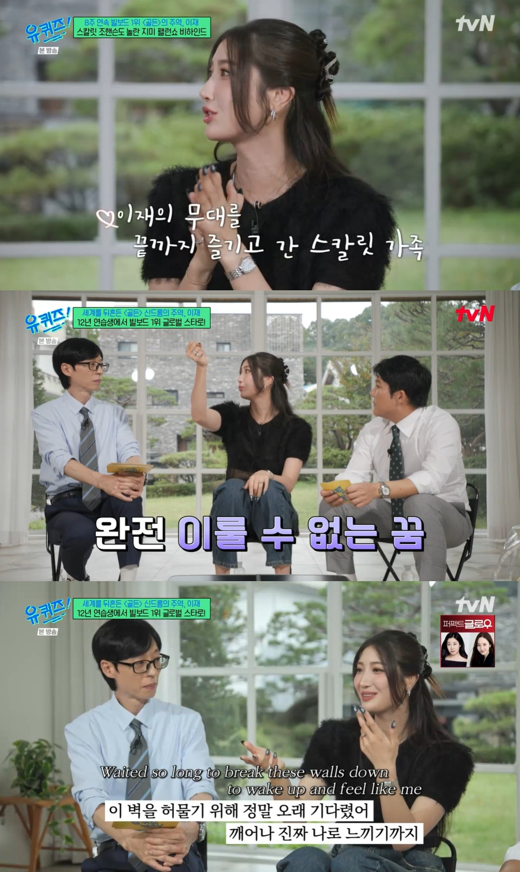 그는 넷플릭스 애니메이션 영화 '케이팝 데몬 헌터스'의 OST '골든'에 대해서 설명했다. 이재는 "모든 노래는 메기 강 감독님이 가이드라인을 줬다. 그때 완전 비현실적인 음을 만들라고 했고, 그게 닿을 수 없는 꿈을 뜻하는 거였다"라며 "내 목소리가 콤플렉스였다. 너무 어둡지 않나. 연습생 시절 콤플렉스였기 때문이었다. 내 목소리 너무 거친 거 같아서 무서웠다. 어릴 때 '올드하다'란 말을 하니 걱정했는데 좋아해 줘서 자신감이 생겼다"라고 이야기했다.