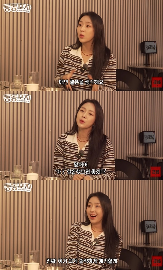 이어 "결혼이라는 게 한다고 마음먹어서 되는 게 아니지 않나. 저는 되게 사랑에 진심이다. 매번 결혼을 생각한다"며 "같이 있다 보면 너무 좋고, '결혼했으면 좋겠다'하는 생각을 하지 않냐. 남자들이 안 데려가는 게 아니라 제가 약간 눈이 높은 거 같다"고 밝혔다.