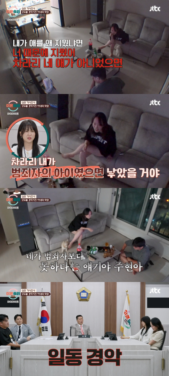 이후 관찰 카메라에서 아내는 남편과 언쟁이 일자 남편에게 "내가 애를 왜 지웠냐. 너 때문이다. 네가 아니라 차라리 범죄자의 아이였으면 낳았을 거다. 네가 범죄자보다 못하다는 얘기"라고 말해 충격을 안겼다.