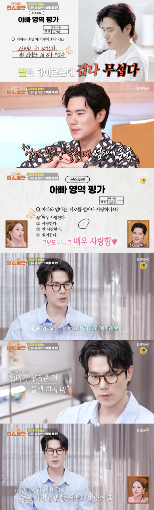 이어 '아빠의 요리 특징'을 묻는 질문에 두 아들은 나란히 "중식만 한다. 채소가 많다. 싱겁다"라고 적었다. 김강우는 이를 읽으며 "어쩔 수 없다. (개선할 생각) 없다"라며 단호한 모습을 보였다.