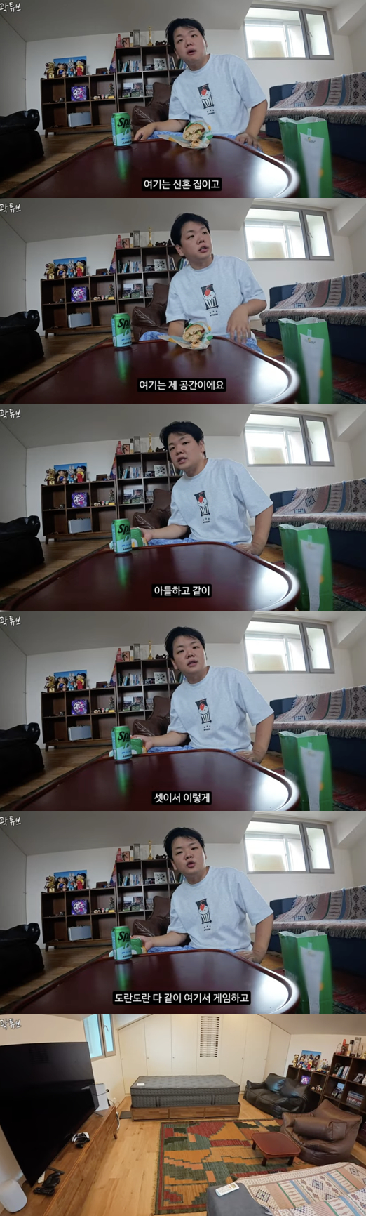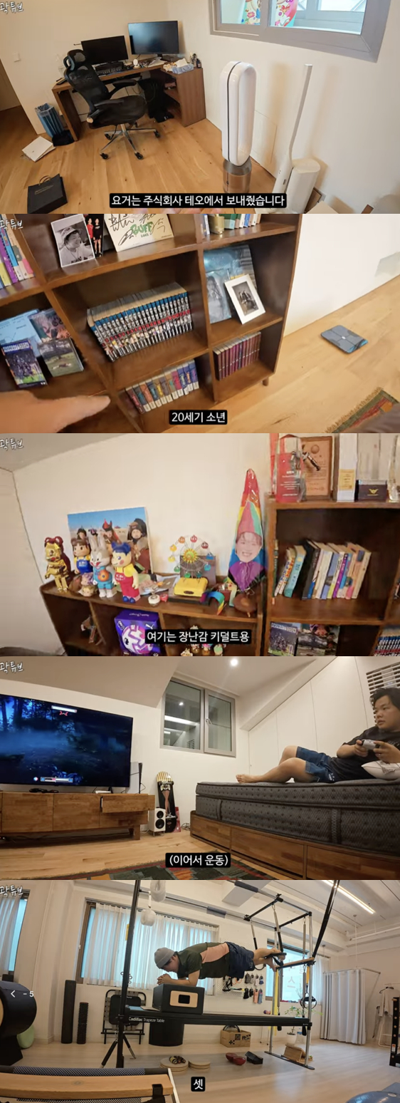 그는 "아내와 아들, 셋이서 여기서 도란도란 만화 보고, 비디오책 보고 싶은 게 내 로망이었다"며 아늑한 공간을 소개했다.