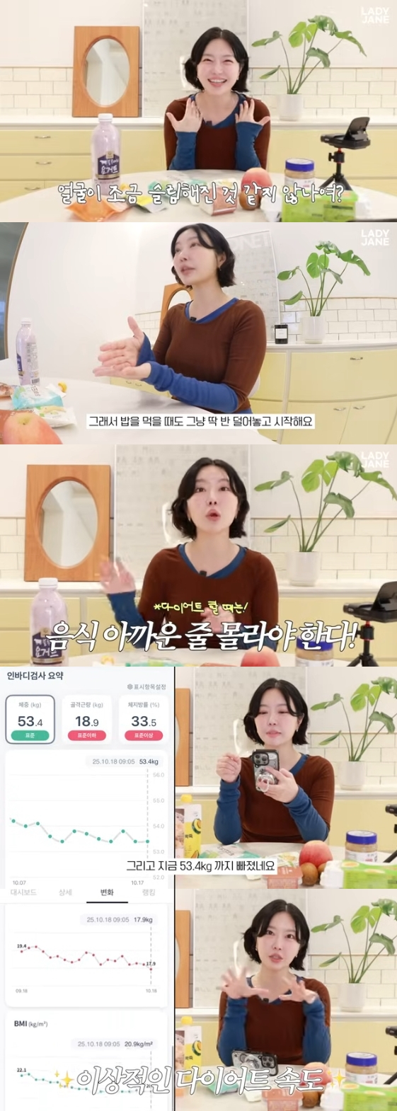 그런가 하면 레이디제인은 자신의 인바디 기록을 공개해 시선을 모았다. 그는 "56.8kg에서 시작해서 53.4kg까지 빠졌다. 약 3.5kg을 감량했다. 한 달 동안 이 정도면 아주 이상적인 속도라고 생각한다"라고 말했다.