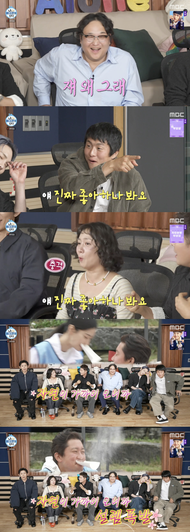 이 장면을 본 '나혼산' 멤버들은 즉각 반응했다. "쟤 왜 그래?", "진짜 좋아하나 봐", "자연이가 가까이 와서 설렌 것", "너 왜 여기서 연애 프로그램을 찍냐" 등 폭소와 야유가 동시에 터져 나왔다.