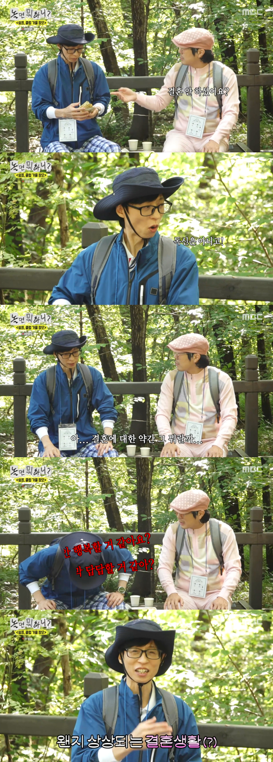 당황한 유재석을 향해 하하는 "왜 그러냐. 결혼하면 안 행복할 거 같냐. 답답할 거 같냐. 혼자만의 시간이 없을 거 같냐"고 쏘아붙여 웃음을 자아냈다.