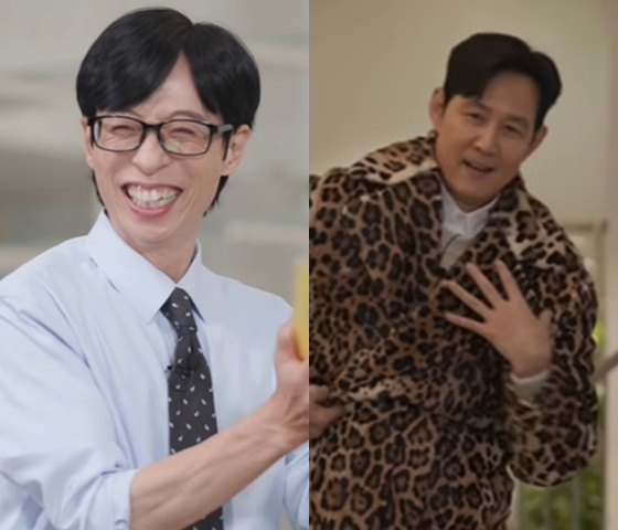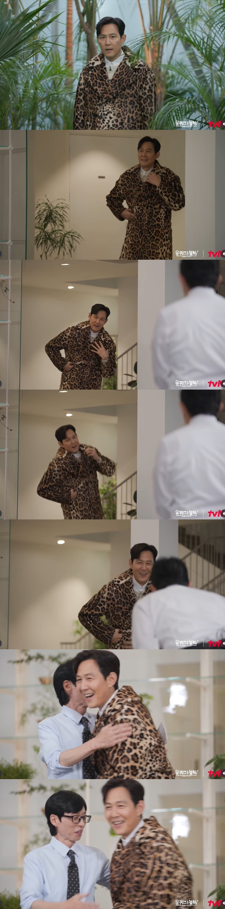 유재석은 "호피를 두르고 왔어"라며 이정재와 포옹하는 모습을 보였고 이정재도 함박웃음을 터뜨렸다.