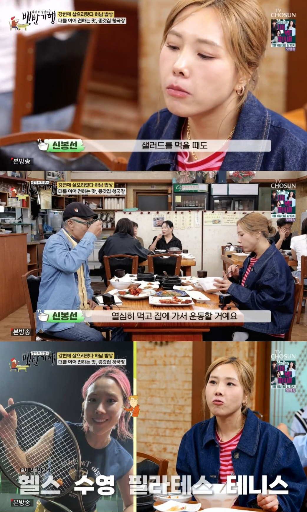 이날 허영만은 신봉선에 "이렇게 먹는데도 다이어트하는 게 신기하다"라고 감탄했다. 이에 그는 "샐러드 먹을 때도 코끼리처럼 먹는다. 이만큼 먹는다. 열심히 먹고 집에 가서 운동 좀 할 거다. 헬스도 하고 수영, 필라테스, 테니스 했다"라며 "좀 웃길지 모르겠지만 요즘엔 발레도 좀 한다"라고 털어놨다.