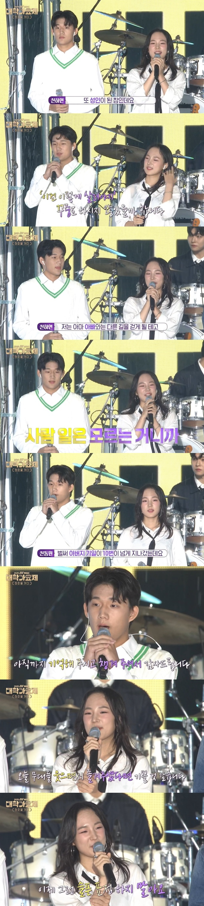 이어 신해철의 자녀 신하연, 신동원이 루시와 함께 '그대에게' 무대를 꾸몄다. 신하연은 "저는 이제 미국에서 대학생이 됐고 또 성인이 된 참인데 성인이 되고 처음으로 선 무대가 '대학가요제'라서 정말 뜻깊고 영광이었다"라고 인사했다.