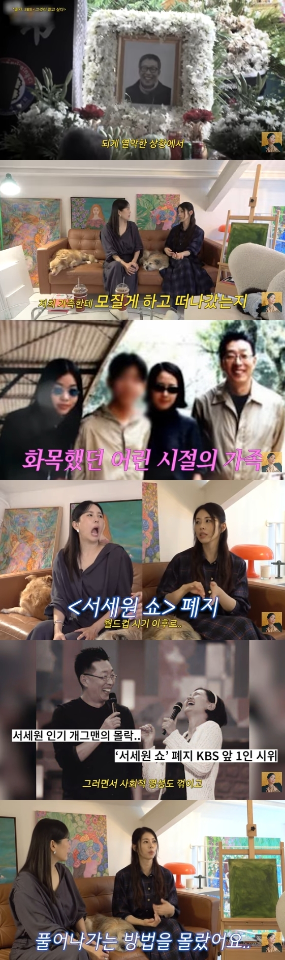 그는 "어릴 때는 아버지가 자상한 면도 많았고 좋은 추억도 많았는데 어느 순간부터 많이 변하셨다"며 "'서세원 쇼' 폐지 이후로 사회적으로 명성도 꺾이고 본인이 너무 힘들었는데 그걸 잘 풀어나가는 방법을 몰랐던 것 같다. 엄마한테 계속 분풀이하게 되니까 안 좋아졌다"라고 고백했다.
