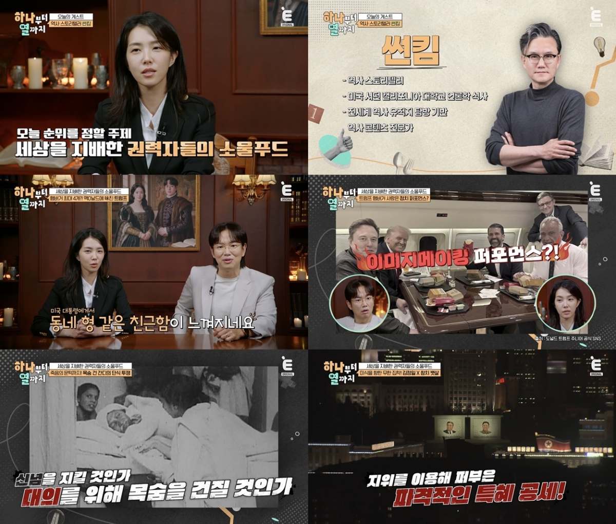 3일 오후 8시 방송되는 티캐스트 E채널 '하나부터 열까지'에서는 '지식강장 MC' 장성규와 강지영, 그리고 스페셜 게스트로 '역사 스토리텔러' 썬킴이 출연해 전 세계를 쥐락펴락했던 인물들의 식탁 위 비밀을 유쾌하고도 날카롭게 해부한다. 그들의 취향 속에 숨은 욕망과 권력 그리고 인간적인 면모까지 생생하게 짚어내며, 그 뒤에 숨겨진 놀라운 이야기들을 생생히 풀어낸다.