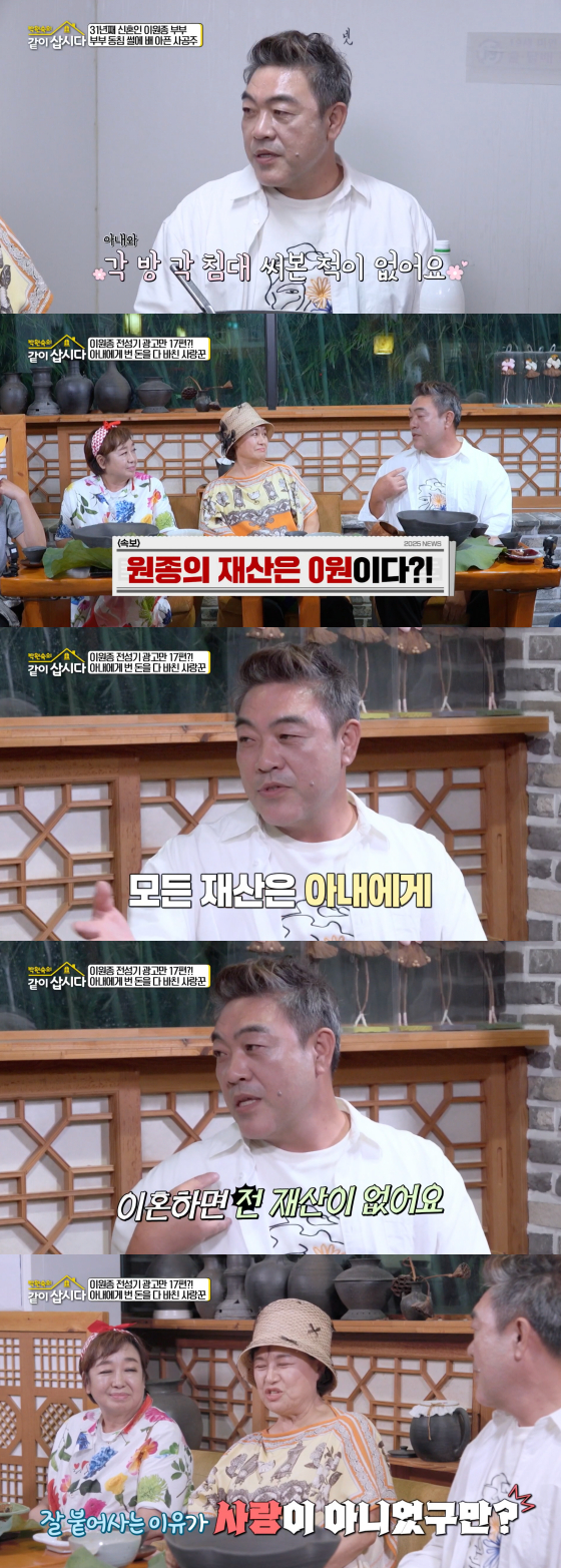 그러면서 "저는 재산이 0원이다. 모든 재산이 다 아내 앞으로 돼 있어서 이혼하면 제 앞으로는 재산이 없다. 0원이다. 재산세도 안 낸다"고 아내에 대한 남다른 애정을 표했다.