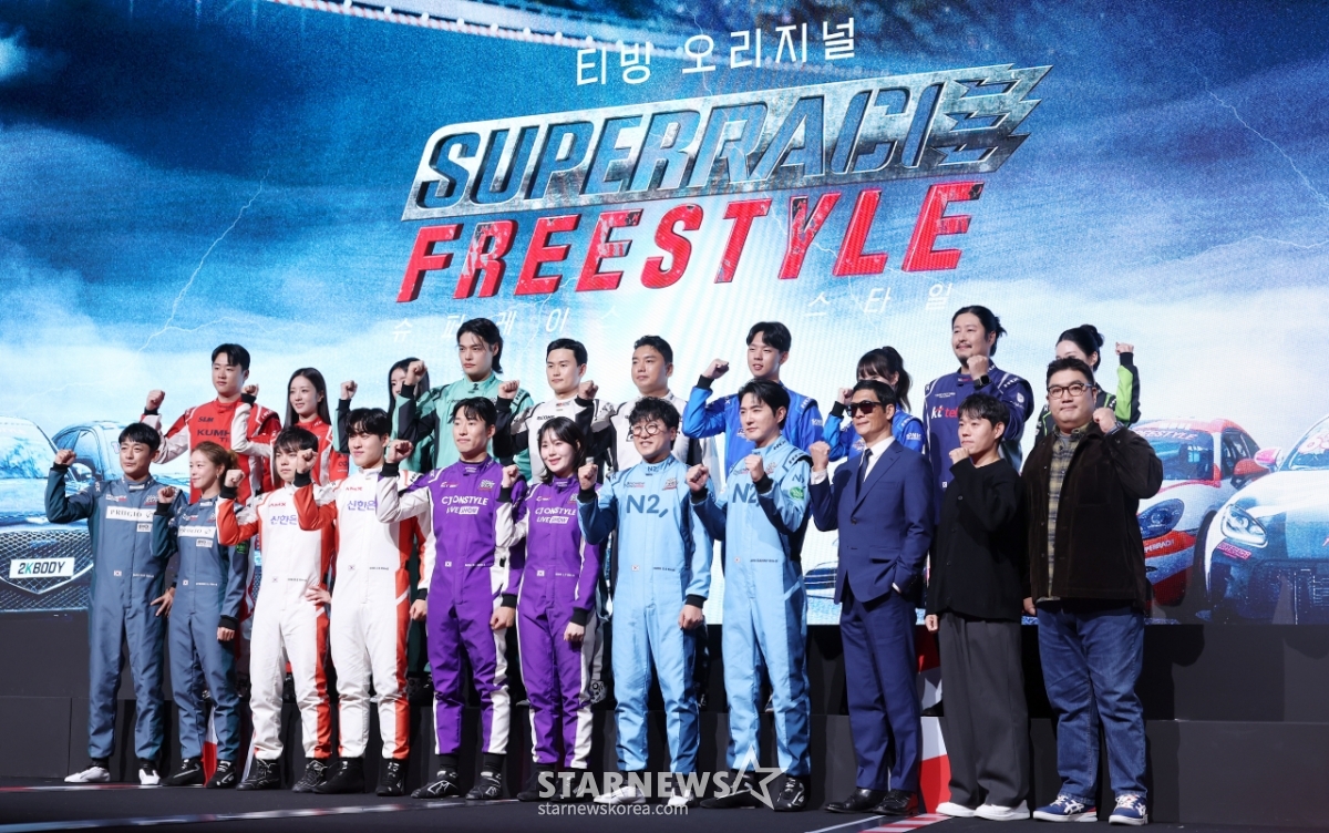 이창욱 선수, 가수 윤보미, 박시현 선수, 방송인 정혁, 최광빈 선수, 개그맨 곽범, 김시우 선수, 오마이걸 승희, 황진우 선수, 모델 윤하정, 이우형 EP, 최영락 PD, god 박준형, 데니안, 박규승 선수, 개그우먼 엄지윤, 노동기 선수, 개그맨 조진세, 김동은 선수, 배우 경수진, 한민관 선수(뒷줄 왼쪽부터 시계방향)가 5일 서울 중구 웨스틴조선호텔에서 진행된 티빙 예능 '슈퍼레이스 프리스타일' 제작발표회에 참석해 포즈를 취하고 있다. /2025.11.05