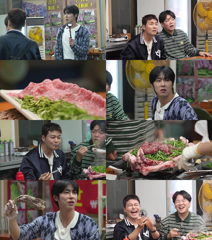 그러더니 사장님은 어느 곳에서도 맛볼 수 없는 '살치살 육사시미'를 한 접시 썰어준다. 이를 받아든 정윤호는 "사장님이 레슨을 해주시는 것 같다. 이건 첫 번째 레슨~"이라며 자신의 '밈'까지 소환해 웃음을 안긴다. 전현무도 "사장님 열정이 '여자 정윤호' 같다"고 받아쳐 대환장 케미를 이룬다. 뒤이어 세 사람이 난생 처음 경험한 '살치살 육사시미'에 감탄하며 먹방에 돌입하는데, 이후로도 미나리 소갈비뼈 불판과 철판에 익혀진 살치살&안창살 스테이크, 갈비 전골, 도가니탕이 끊임없이 서빙된다. 이에 '열정맨' 정윤호는 "제발 멈춰줘요~"라며 애걸하기까지 해 모두를 폭소케 한다.
