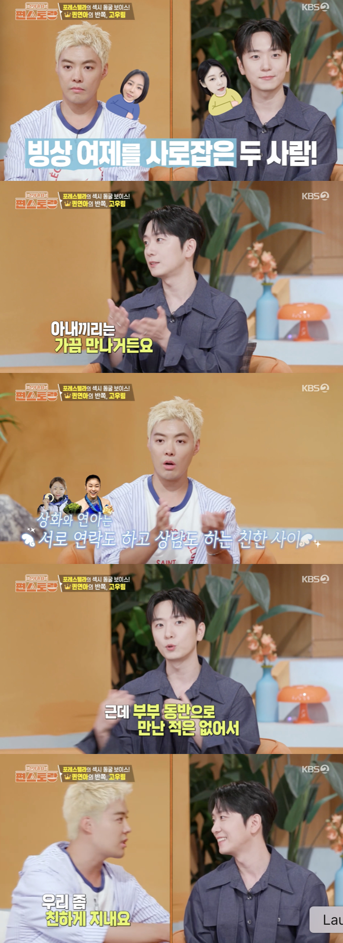 고우림은 "아내끼리는 가끔 만난다"라며 김연아와 이상화가 종종 교류하고 있음을 밝혔다. 이에 강남은 "(김연아와 이상화는) 연락도 하고 상담도 하고 그런다. 둘이 약간 좀 잘 맞는 것 같다"라고 덧붙여 두 사람의 친분을 전했다.