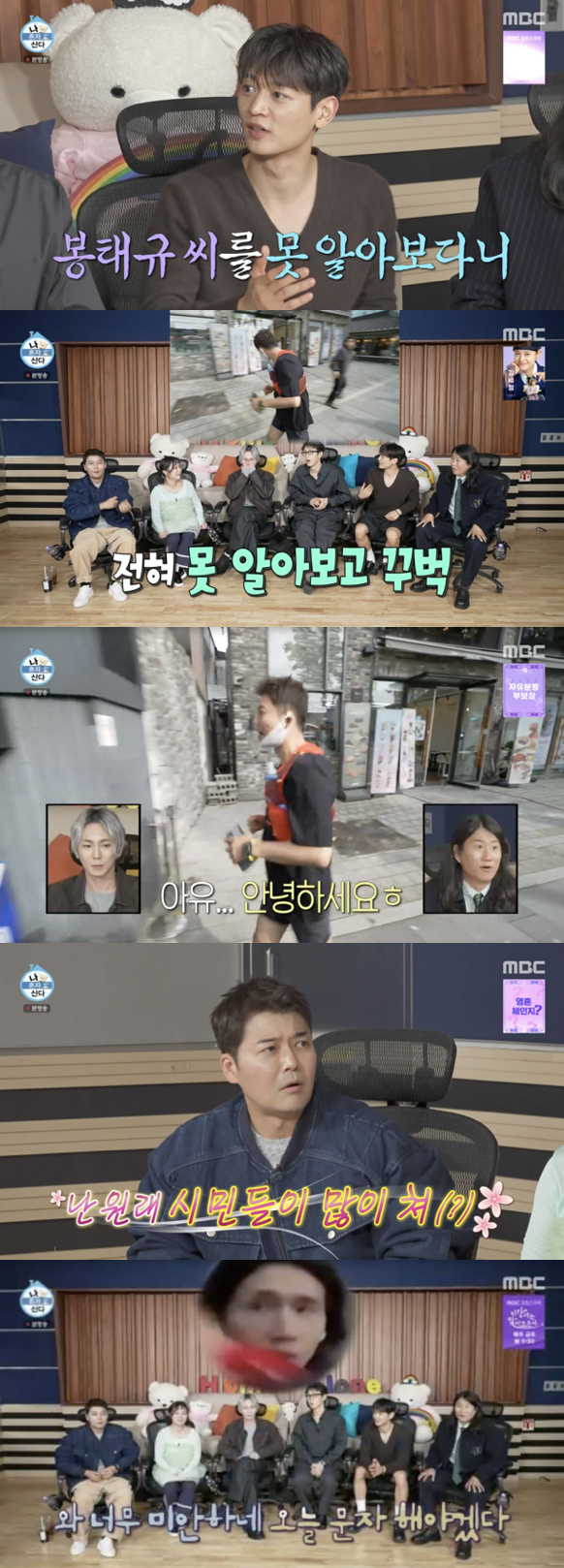 그러나 러닝에 몰두하던 중, 지나가던 한 시민이 어깨를 툭 치며 "형!" 하고 인사를 건넸고, 전현무는 별다른 의심 없이 "아유, 안녕하세요"라며 가볍게 인사하고 지나쳤다. 문제는 그 시민의 정체가 바로 배우 봉태규였다는 것. 이를 지켜보던 무지개 회원들은 라며 일제히 놀라워했다.