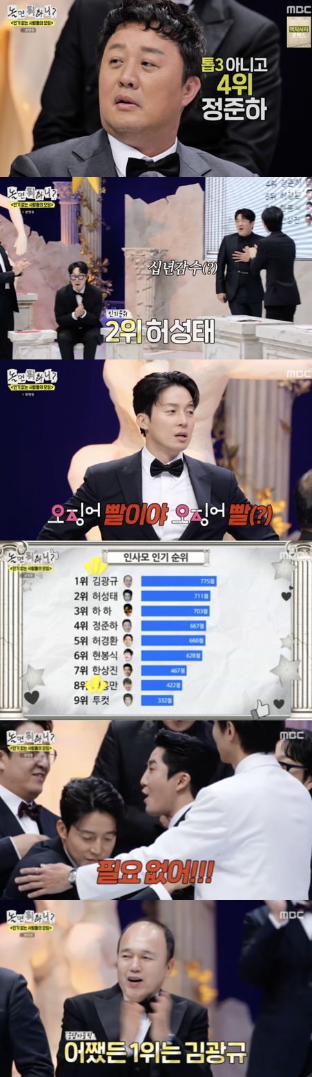 가장 높은 순위인 1위는 김광규였다. 그는 최근 출연한 tvN 화제작 '폭군의 셰프'를 언급하며 "드라마 덕분"이라며 겸손한 태도를 보였고, 주우재는 "김광규 결혼할 수 있겠다"고 농담해 웃음을 자아냈다.