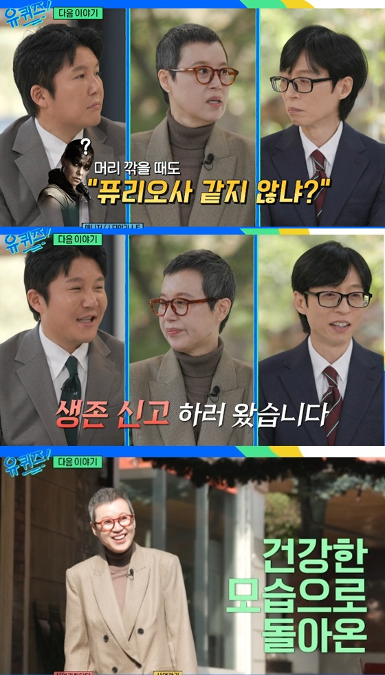 사진 속 박미선은 머리를 짧게 자르고 등장, 유재석과 함박웃음을 터트리며 즐거운 시간을 보낸 모습이었다.