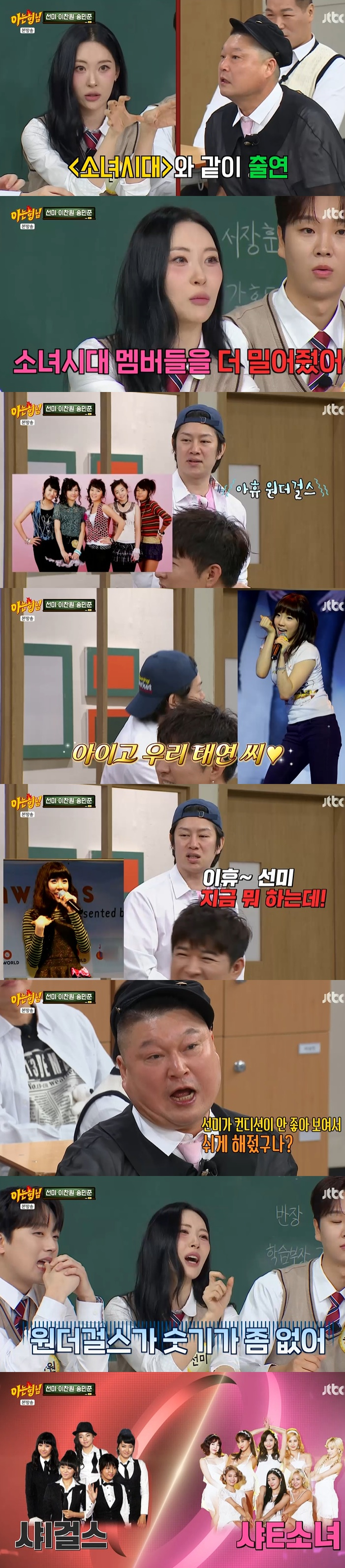 이에 강호동은 "선미가 컨디션이 안 좋아 보여서 내가 쉬게 해줬구나"라고 했고, 선미는 "원더걸스가 샤이했다"라고 밝혔다.