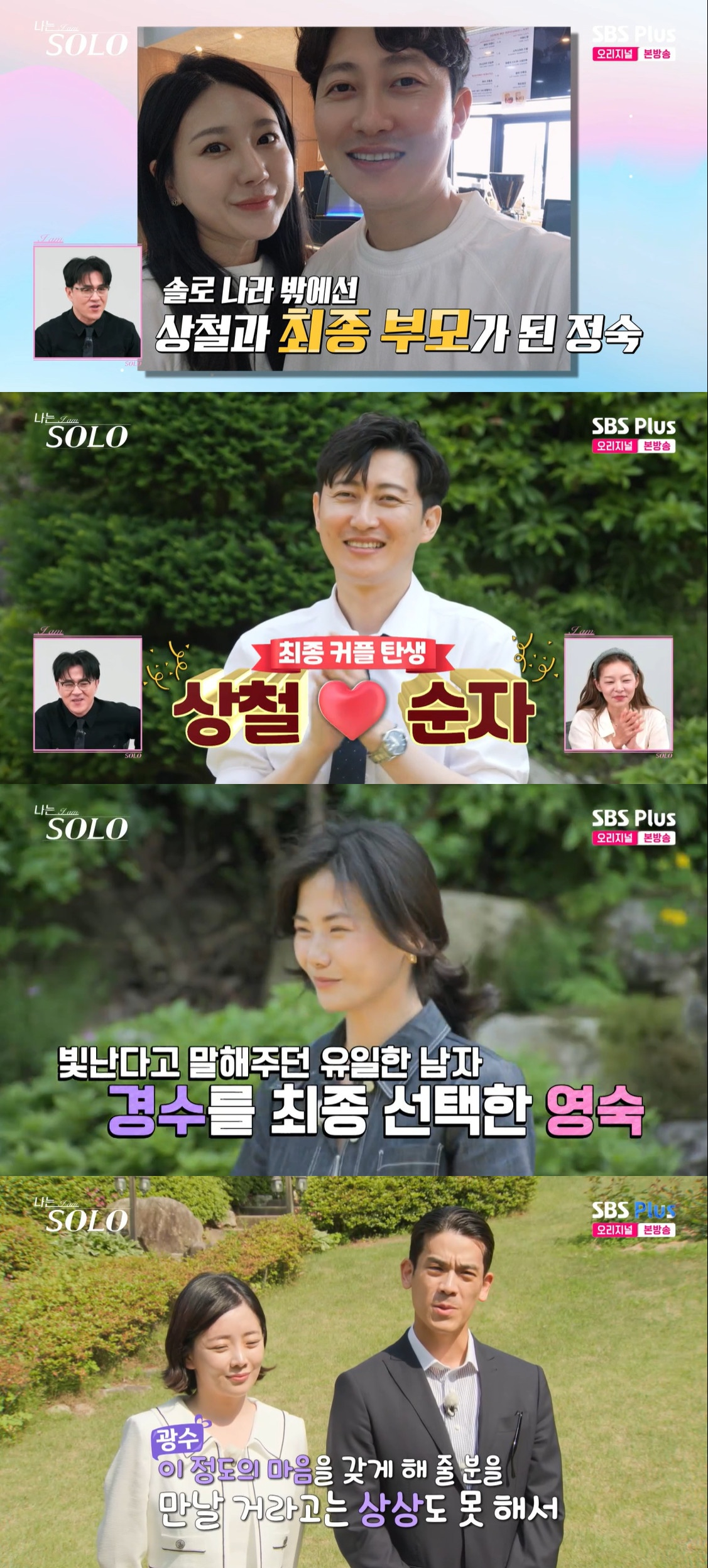 방송 전부터 화제됐던 '나솔이'의 부모는 정숙과 상철이었다. 데프콘은 "아이 탄생을 앞두고 있다. 최종 커플이 됐지만, 결이 맞는 사람을 찾았을 수도 있다. 방송 이후에도 많은 일이 있었을 거다"라고 응원했다.