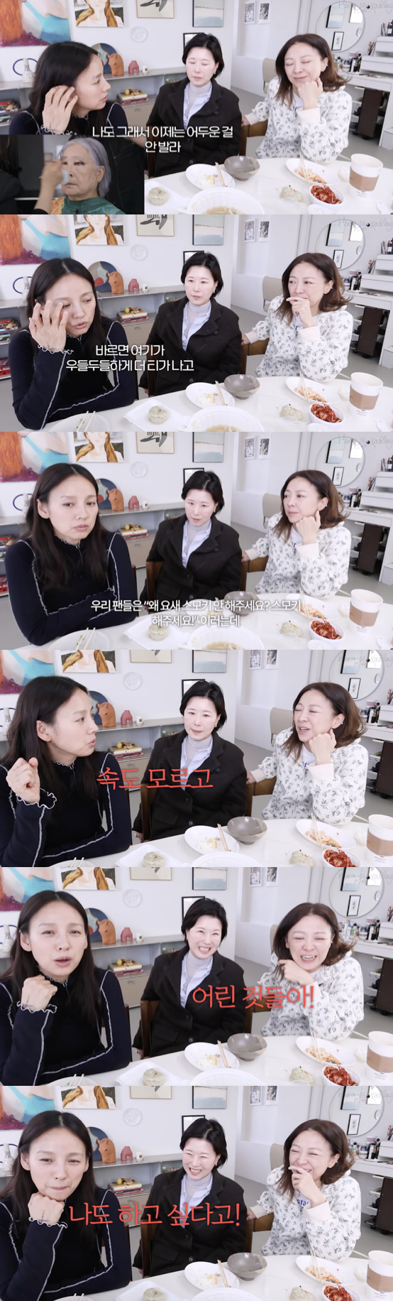 그러면서 팬들의 요청을 언급하며 "우리 팬들은 '왜 요새 스모키 안 해주세요? 스모키 해주세요!' 이러는데 내 속도 모르고. 이것들아 나도 하고 싶다고"라며 웃픈 속내를 전했다. 나이가 들며 눈 주름이 깊어져 스모키를 쉽게 하지 못한다는 현실적인 이유였다.
