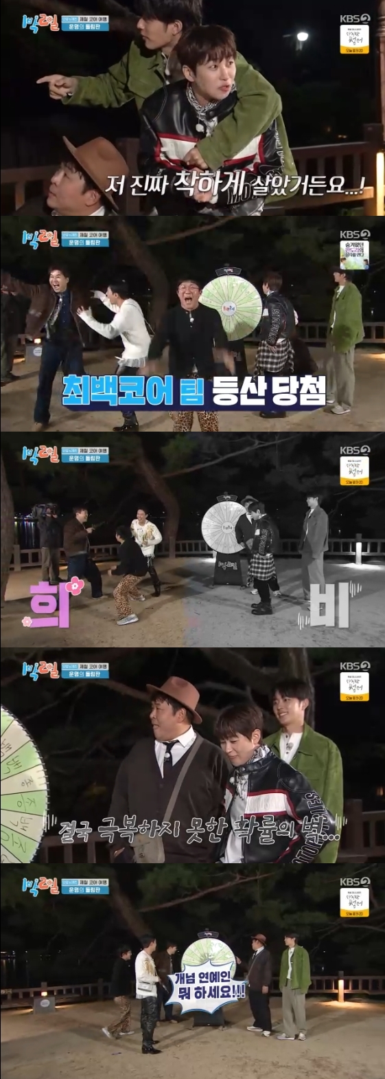 이날 멤버들은 종조준 팀(김종민, 조세호, 이준)과 최백코어(문세윤, 딘딘, 유선호) 팀으로 나뉘어 돌림판 게임을 진행했다. 돌림판을 돌려 지목된 팀은 다음 날 새벽에 월악산을 등반하는 벌칙을 수행하게 된다.