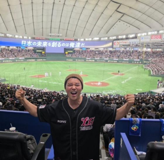공개된 사진 속에는 가득 찬 관중석을 배경으로 포즈를 취하고 있는 전현무의 모습이 담겼다. 그는 야구 유니폼을 입고 주먹 쥔 두 팔을 벌리고 환하게 웃고 있다.