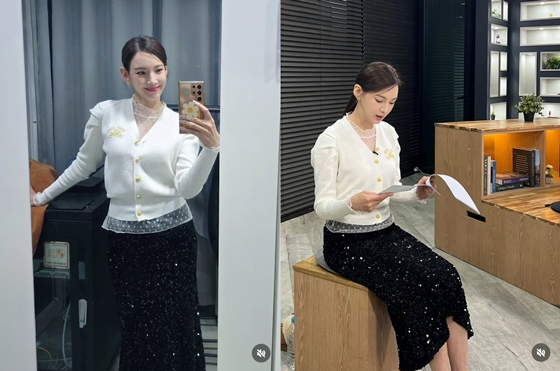 공개된 사진 속에서 정가은은 화이트 카디건에 블랙 스팽글 스커트를 매치해 고급스러운 룩을 완성했다.