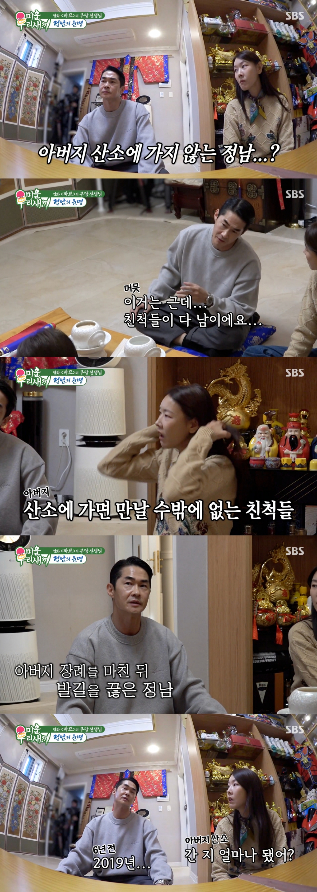 이에 배정남은 머뭇거리다 "친척들이 그냥 아예 남"이라고 털어놨다. 옆에 있던 한혜진이 "(산소가) 선산이구나"라며 공감했고, 배정남은 "그렇다. 산소를 가면 만나게 된다"고 토로했다.