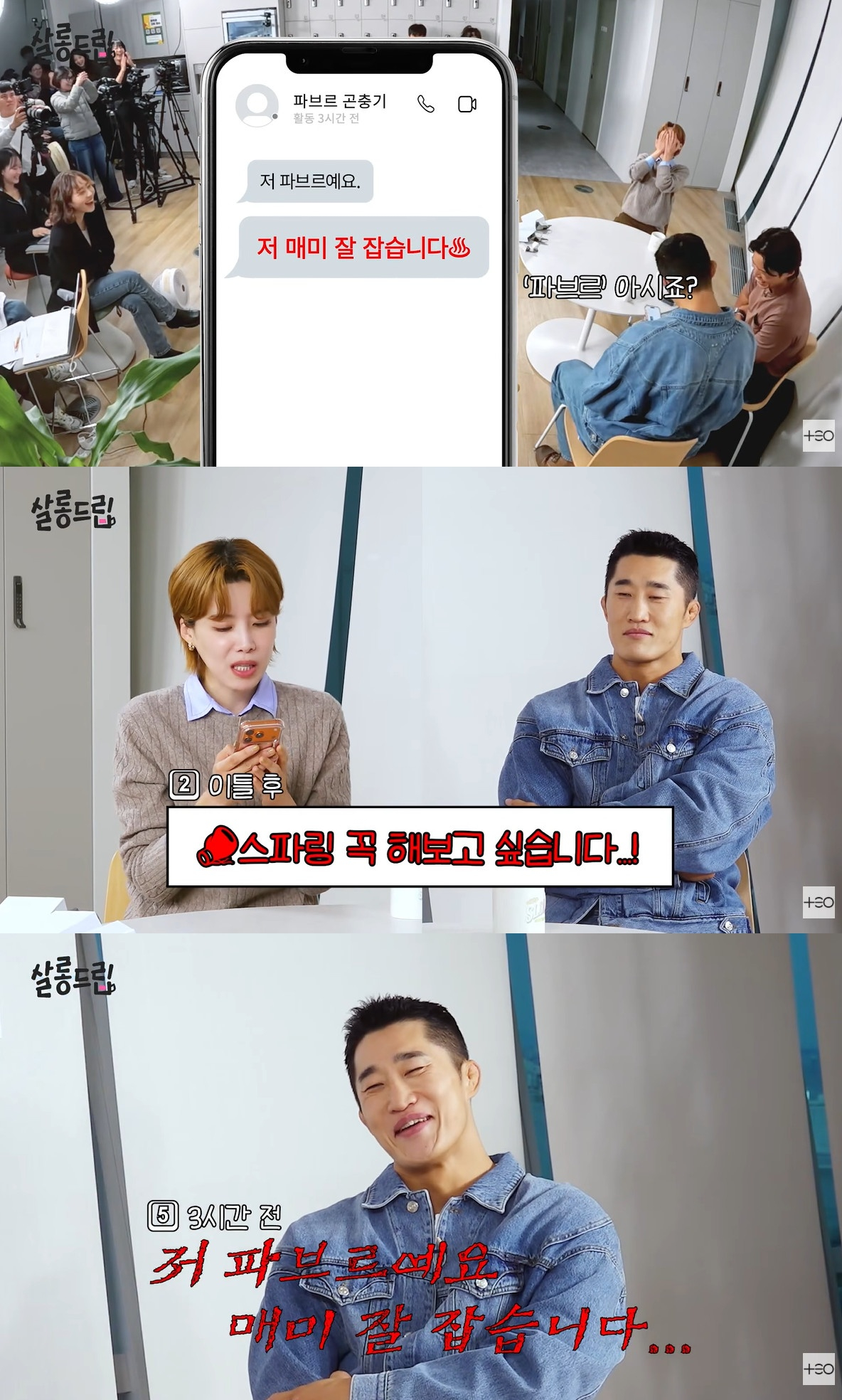 장도연은 김동현의 DM 창을 보더니 "이 친구는 8월부터 러브콜을 보냈다. 처음엔 예의를 갖췄다. '스파링을 해보고 싶다'라고 하자 답장이 없어서 '형 해보고 싶어요'한 거다. 그러다 세 시간 전 '매미 잘 잡습니다' 했다"라고 했다.