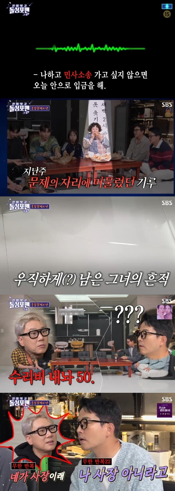 김준호는 "기루한테 내가 얘기하겠다. 기루가 깼는데 왜 내가 내냐. 나 사장 아니다"라고 반박했고, 이상민은 "50만원 입금하면 끝난다"라고 쏘아붙였다.