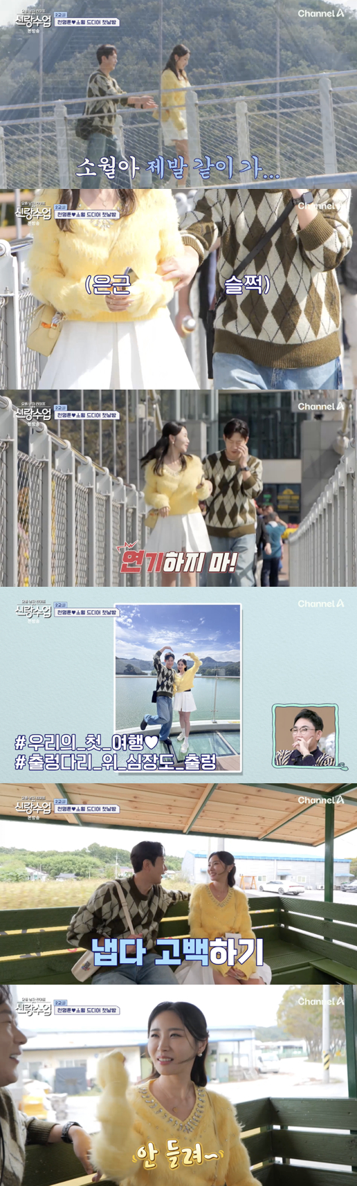 두 사람은 먼저 관광 명소인 붕어섬 출렁다리에 올랐다. 420m 높이의 흔들리는 다리 위에서 천명훈은 일부러 무서운 척을 하며 은근슬쩍 스킨십을 시도하며 "손 좀 잡아줘"라고 말해 흐뭇한 웃음을 불렀다.