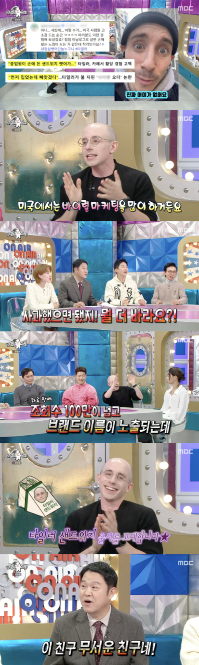 그러면서 타일러는 특유의 센스 있는 제안을 던졌다. 그는 "미국에서는 바이럴 마케팅을 많이 한다. 이런 이슈가 생기면 그 사람을 위한 샌드위치를 출시한다"라고 말했다. 이에 패널들은 "사과 받았으면 됐지"라고 했지만 타일러는 진지하게 "바이럴 된 김에 타일러 샌드위치 만드는 건 흔한 마케팅이다. 연락 기다리고 있다"고 덧붙여 웃음을 자아냈다.