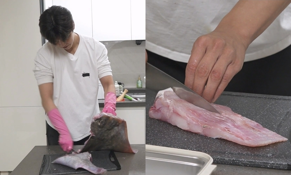 '목포 수라상'의 하이라이트는 바로 홍어. 아이스박스에서 거대한 홍어를 꺼낸 박지현은 "손이 기억해부리구먼~"이라며 거침 없이 손질을 시작한다. 그는 "홍어 손질은 23살 때부터 29살까지 매일 30마리는 기본으로 했다"라며 '홍어 마스터'로서의 자신감을 드러낸다. 7년 동안 손질한 홍어만 약 6만 3천 마리에 달해 무지개 회원들을 깜짝 놀라게 한다.