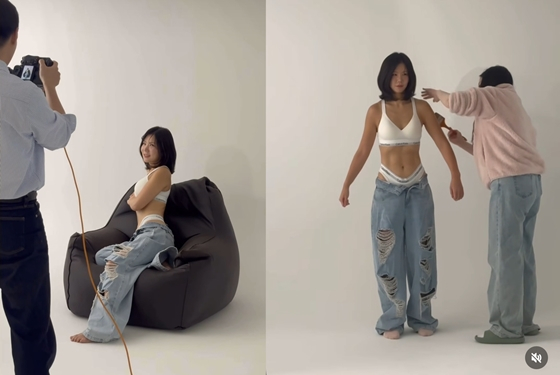 또 다른 컷에는 화이트 탑에 찢어진 청바지를 입고 카메라를 향해 미소 짓고 있다. 탄탄하게 정리된 11자 복근과 매끈한 허리 라인이 돋보인다.
