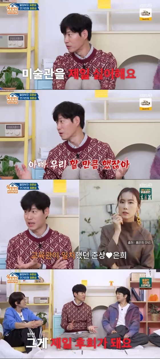 이날 유준상은 자녀들의 특별한 교육법에 대해 언급했다. 그는 "저는 그렇게 해서 하나도 된 게 없다. 아이들이 어렸을 때부터 미술관을 많이 데려갔는데 미술관을 제일 싫어한다. 산에 올라가서 맨발로 걷게 했는데 이제 산을 절대 안 간다"라고 고백해 모두를 폭소케 했다.