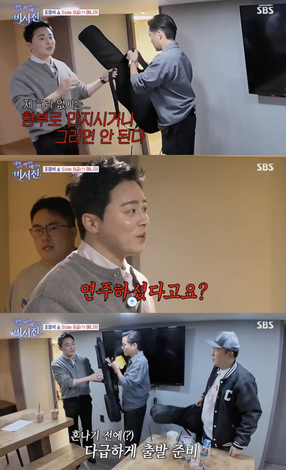 조정석은 기타가 밖에 놓여 있는 것을 보고 "왜 여기 있냐"며 "제 허락 없이는 함부로 만지시거나 그러면 안 된다"고 단호하게 말했다. 제작진이 연주한 사실도 폭로하자 "연주도 하셨다고요?"라며 당황한 기색을 드러냈다.