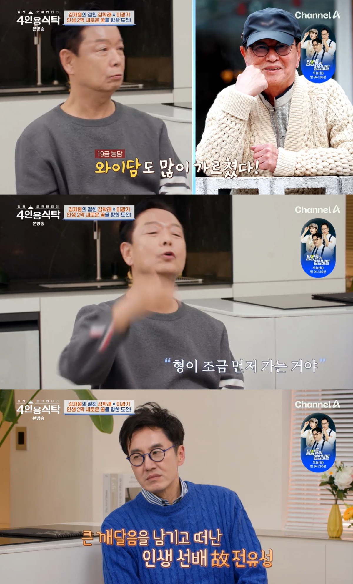 24일 방송된 채널A '절친 토큐멘터리 4인용식탁'에서는 김재원, 김학래, 이광기가 게스트로 출연했다.
