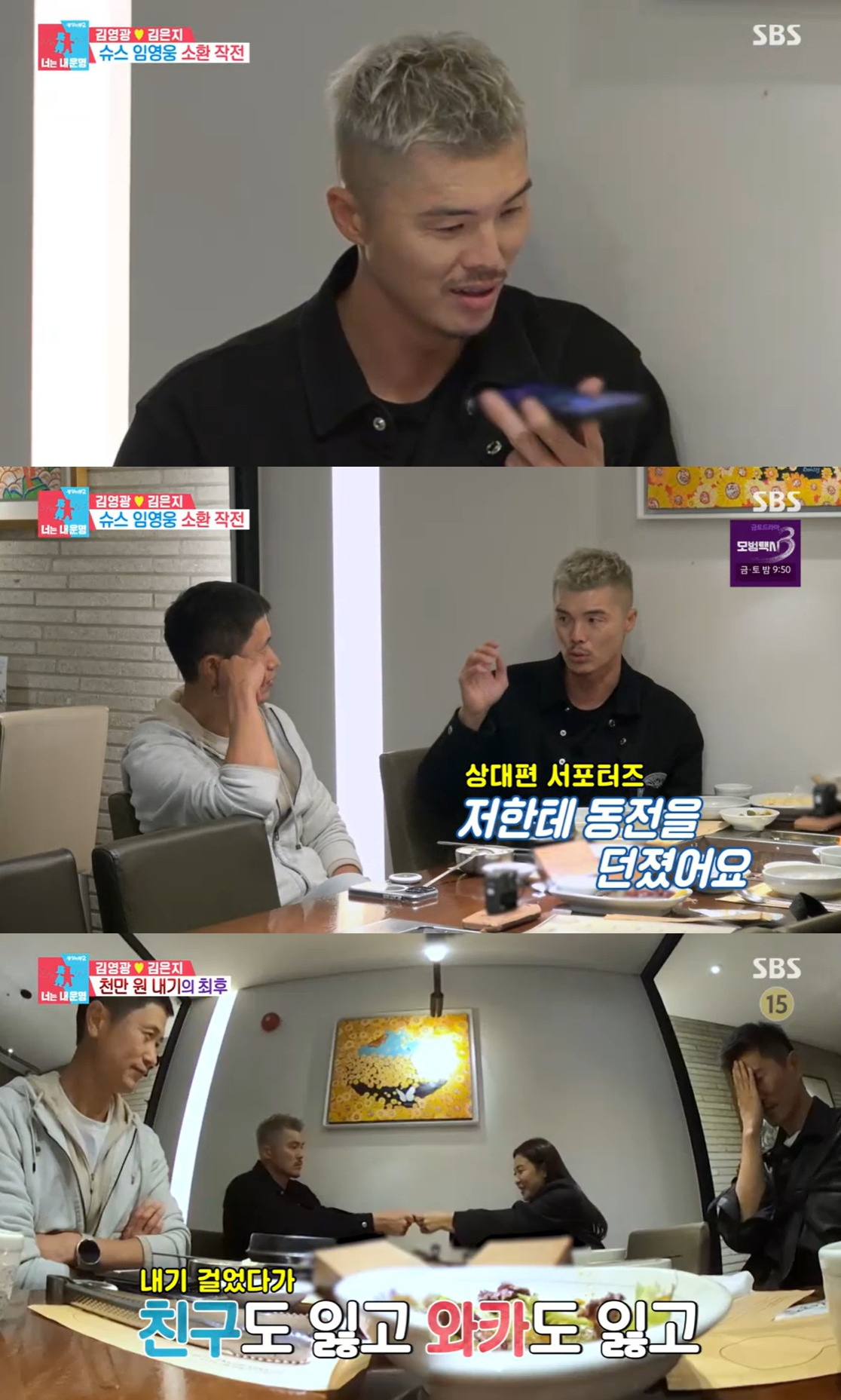 이영표는 김영광의 전화에 달려와 내기의 이유를 들었다. 그는 "한 달에 970만원? 아무리 밥을 사도 그렇게 안 나오는데. 뭘 샀길래 그렇게 나오나"라고 경악했다. 김영광은 "이것도 나를 위한 투자다. 먹는 거니까. 중간에 핸드폰을 샀다"라고 하자, 이영표는 "핸드폰은 네 거 아니냐. 그건 네 카드로 사야지 왜. 할 말이 없다. 은퇴하자마자 2년 동안 아내 카드를 쓴 거냐"라고 황당해했다.