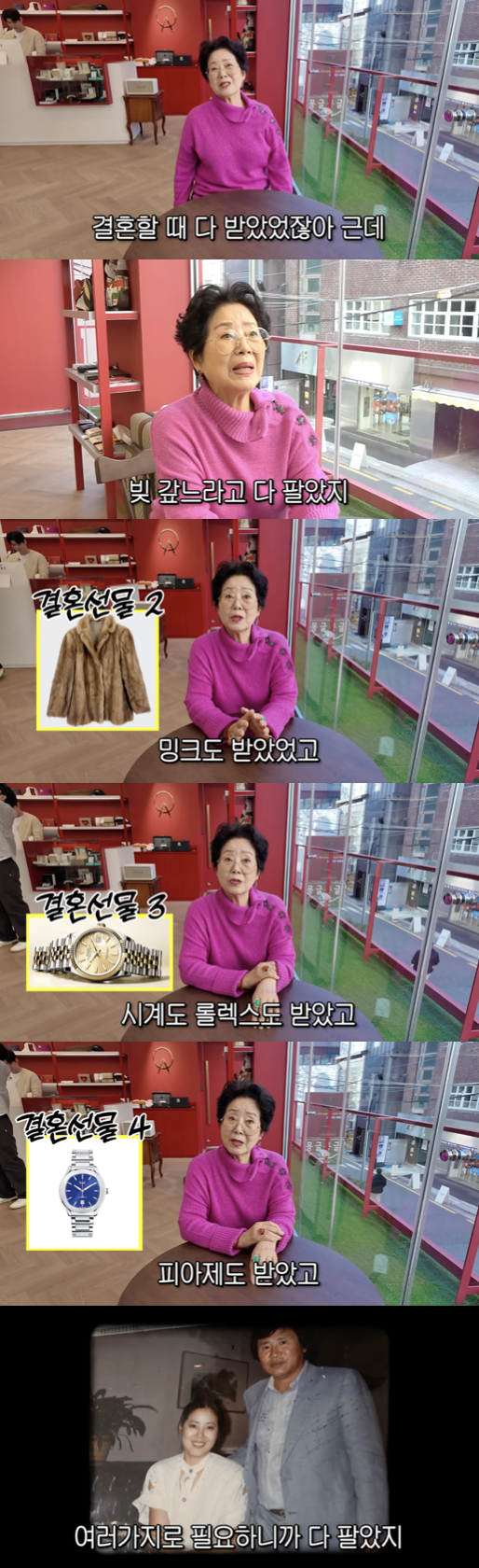 그는 "아버지(=남편)가 선물해줬다. 결혼할 때 다 받았다. 그런데 빚 갚느라 다 팔았다. 친칠라도 받고, 밍크도 받고, 롤렉스도 받고, 피아제도 다 받았다. 그런데 생활을 해야해서 다 팔았다. 그래서 그때 시대에 전당포를 알게 됐다"라고 고백했다.