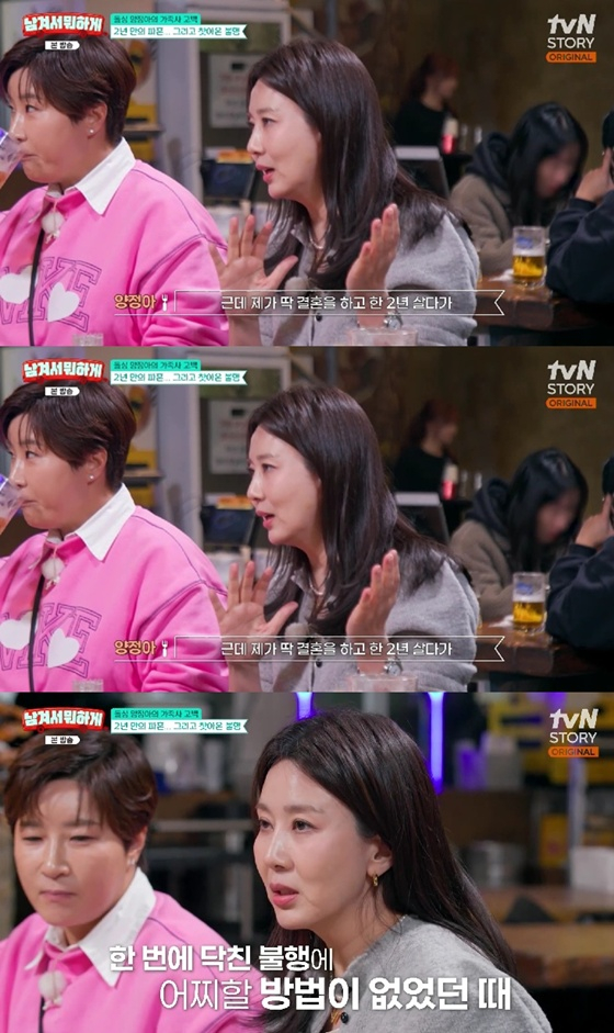 이날 양정아는 "제 삶에 있어서 우여곡절 없이 지냈다. 딱 결혼하고 2년 살다가 잘못되고 나서 그때부터 안 좋은 일들이 생기더라"라며 "그때 이혼하고 아빠도 편찮으시고, 엄마도 간호하시느라 스트레스받아서 대장암에 걸리셨고, 19년 키우던 반려견도 무지개다리를 건넜다"고 밝혔다.